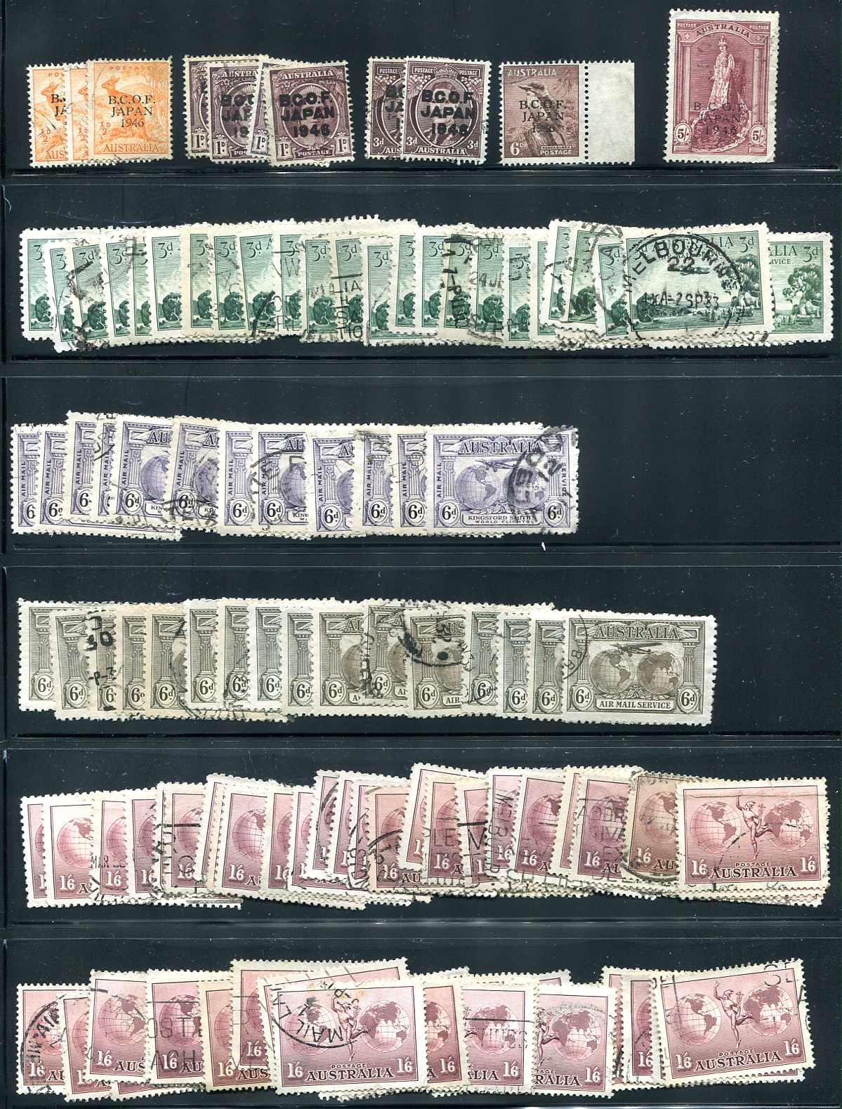 A used accumulation of wholesale quantities of all Airmail issues and a smattering of the "BCOF Japan 1946" overprints. The airmail stamps are between a dozen and 30 copies of each (total catalogue value $886.80). The Military issues include the scarce 5/- "Robes", alas with a corner crease (these catalogue $243.00). There is a small group of "OS", "OS/NSW" and "G/NSW" perfins, most on King George V "Heads" issues which are not counted in the total catalogue value. 2024 Scott US$1129.80 =