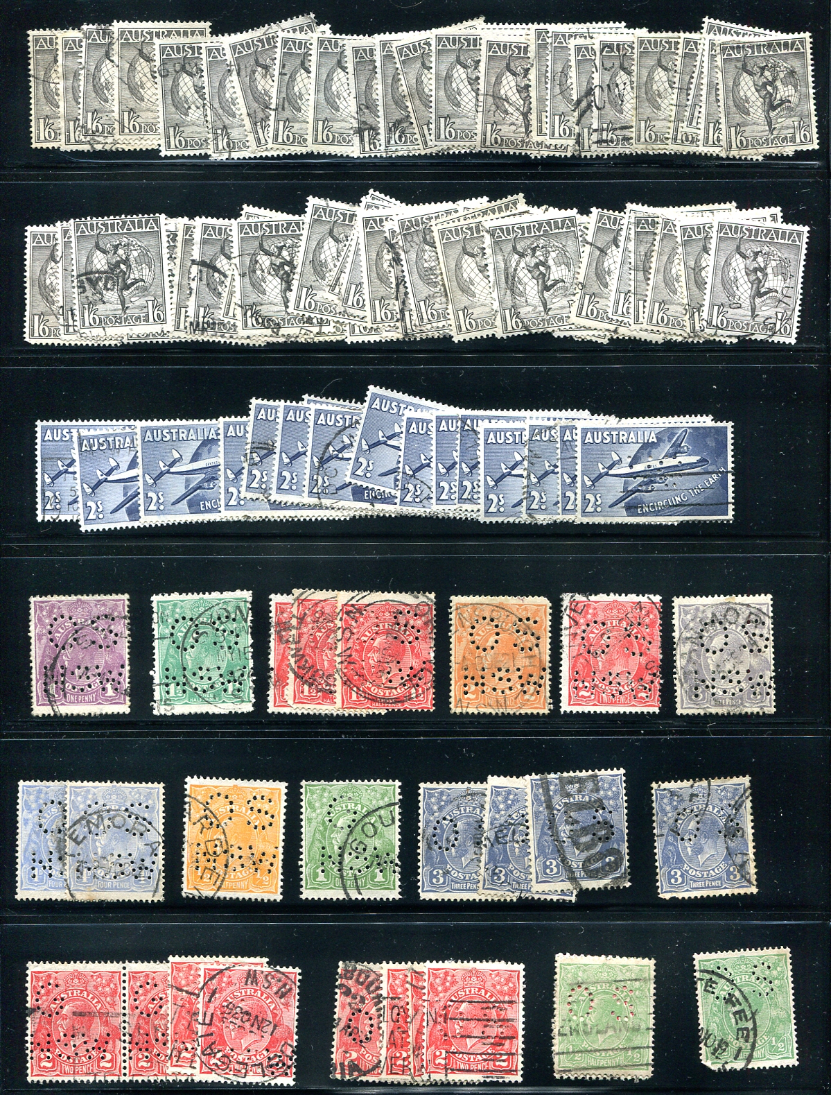 A used accumulation of wholesale quantities of all Airmail issues and a smattering of the "BCOF Japan 1946" overprints. The airmail stamps are between a dozen and 30 copies of each (total catalogue value $886.80). The Military issues include the scarce 5/- "Robes", alas with a corner crease (these catalogue $243.00). There is a small group of "OS", "OS/NSW" and "G/NSW" perfins, most on King George V "Heads" issues which are not counted in the total catalogue value. 2024 Scott US$1129.80 =