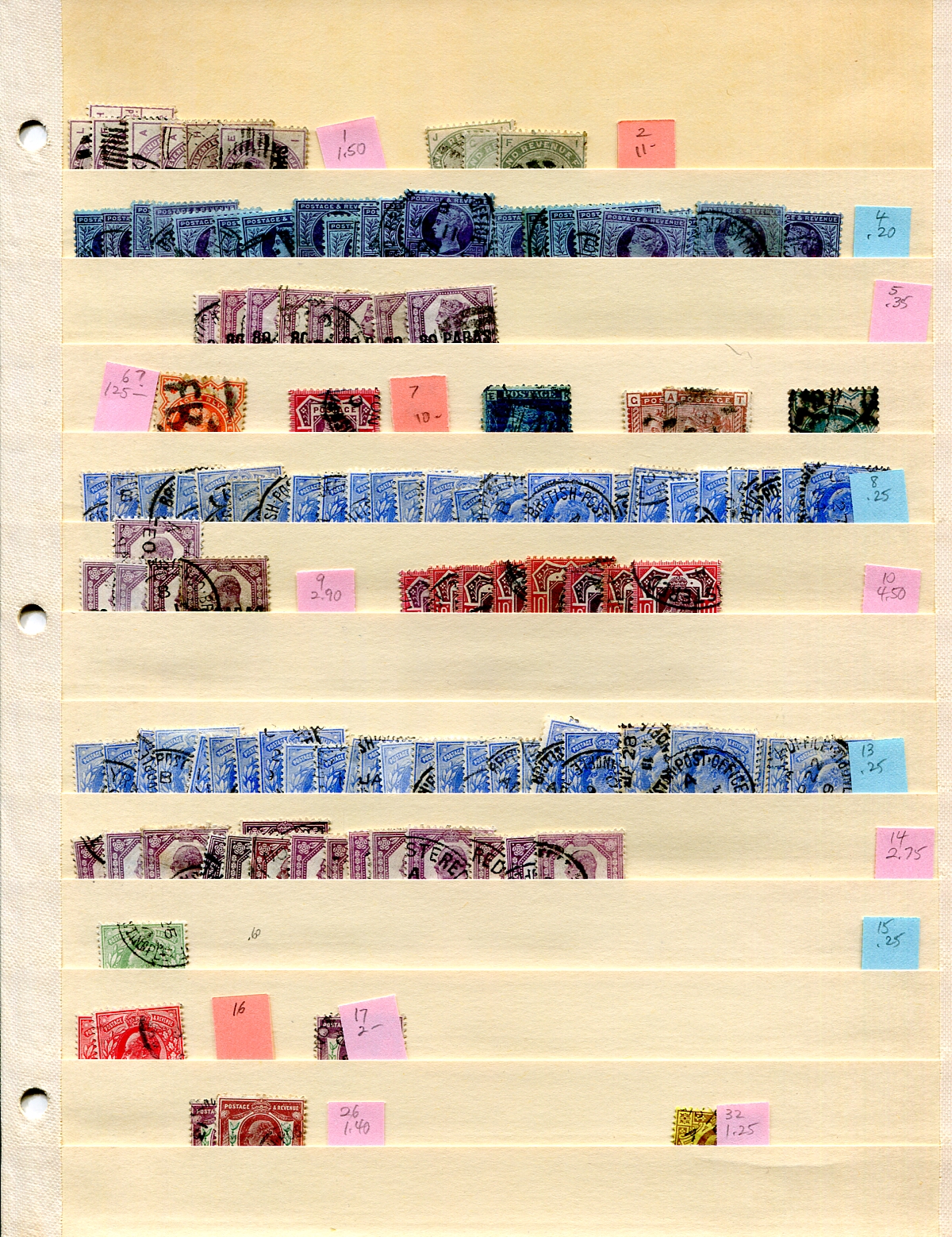 Two pages of mystery and intrigue from the part of the world that invented this concept. A used accumulation with up to 20 of a type, and individual stamps of up to $45.00 catalogue value. Mixed in amongst these overprints are a few dubious examples (including on stamps that were never overprinted!). Nice cancels, a few damaged are not counted in our estimate from this old time holding. These will help you become a better student of these fascinating issues. Estimate =