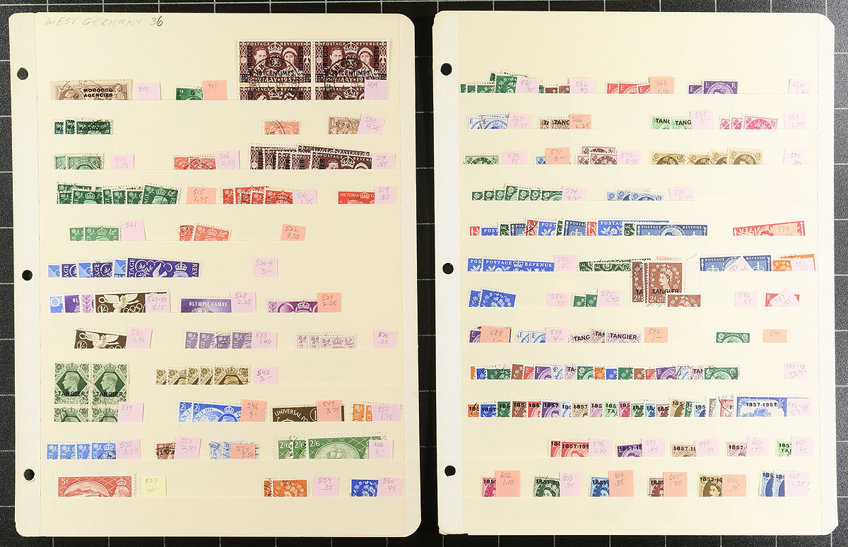 An old time holding of overprinted British issues for use in African and Middle East offices up to the early Elizabethan period. We noted Middle East Forces (#15, #J5), Eritrea, Somaliland (#19), Tripolitania, a half page of offices in "China", lots of "Morocco Agencies", (#206, #207 on piece, #217, #435, #557, #583-611). Neatly arranged on nine manila stockpages, identified by Scott with recent cataloguing. Individual stamps and sets with catalogue values $55.00. Some are duplicated up to 20 of a type. There are lots of nice cancels throughout. Estimate =