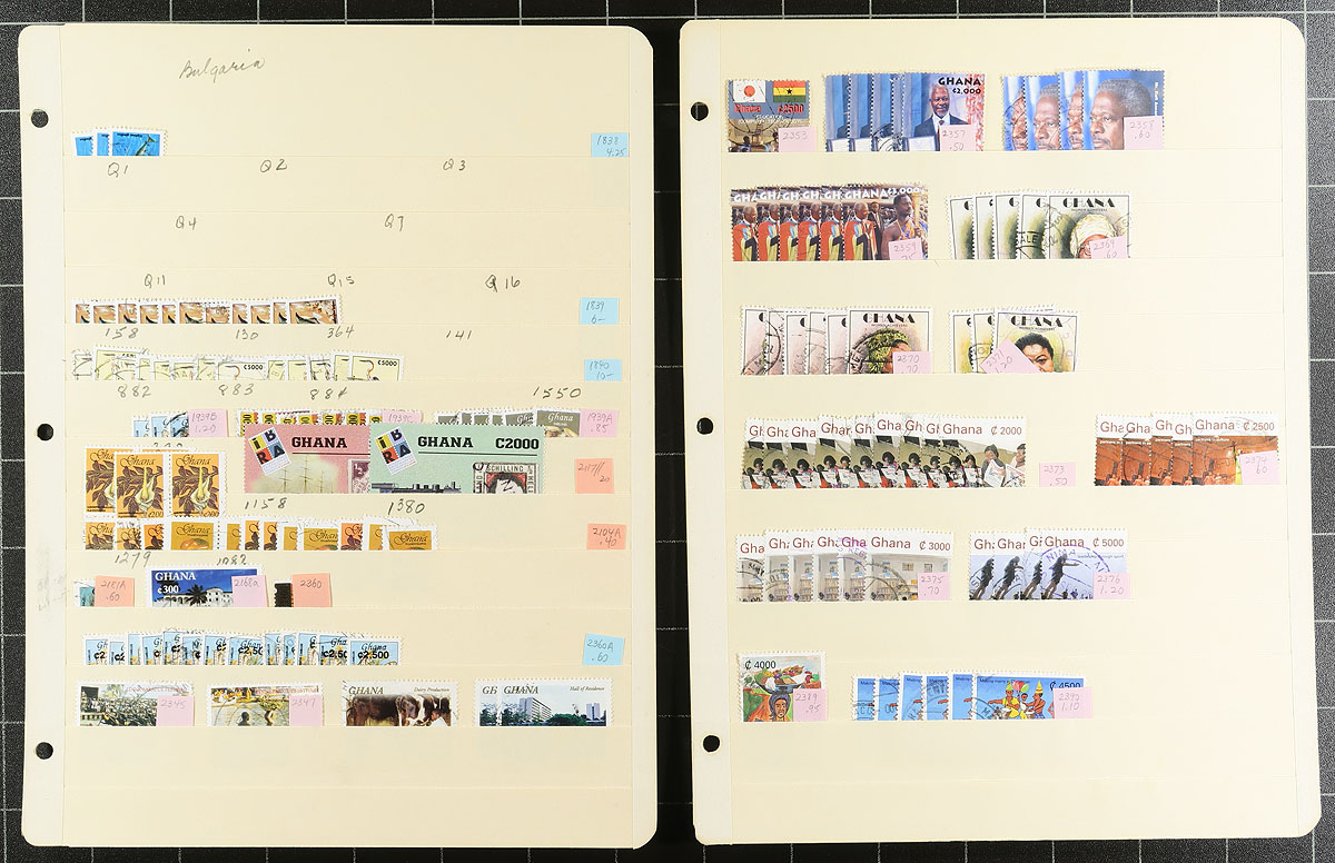 Mint, used (sometimes both) in this accumulation in a half century of post-colonial issues into the early 21st century. Nicely laid out on 21 manila stockpages, starting with overprints on Gold Coast stamps, into the late 1980s hyper-inflation period and then a bit lighter for the next 25 years when inflation was just significant. Generally, up to 20 of a type. We noted #27 (10x mint, 1x used), #60 (mint and used), #97 (mint and used), #300 (mint), #1840 with $2-$10 cataloguing sets and singles throughout. Lots of great African topical issues. here. Not often seen holding, certainly not with the amount of post-1980 material that this lot has. Estimate =