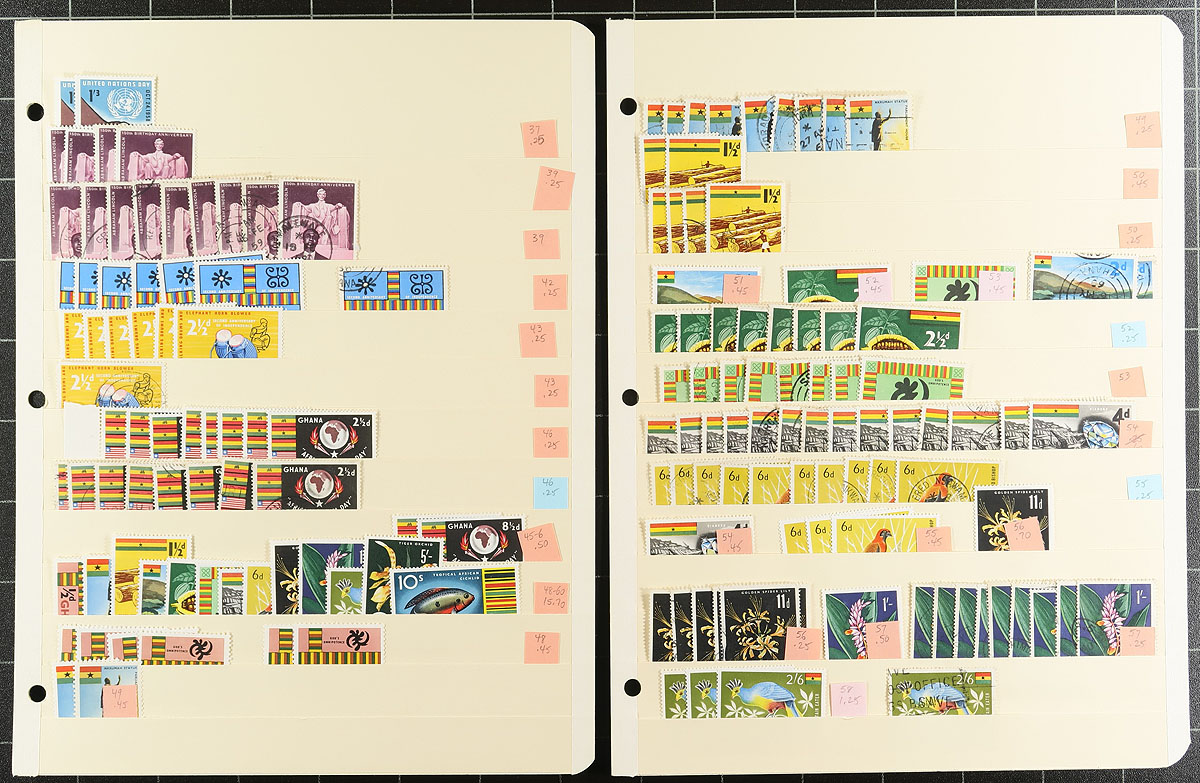 Mint, used (sometimes both) in this accumulation in a half century of post-colonial issues into the early 21st century. Nicely laid out on 21 manila stockpages, starting with overprints on Gold Coast stamps, into the late 1980s hyper-inflation period and then a bit lighter for the next 25 years when inflation was just significant. Generally, up to 20 of a type. We noted #27 (10x mint, 1x used), #60 (mint and used), #97 (mint and used), #300 (mint), #1840 with $2-$10 cataloguing sets and singles throughout. Lots of great African topical issues. here. Not often seen holding, certainly not with the amount of post-1980 material that this lot has. Estimate =