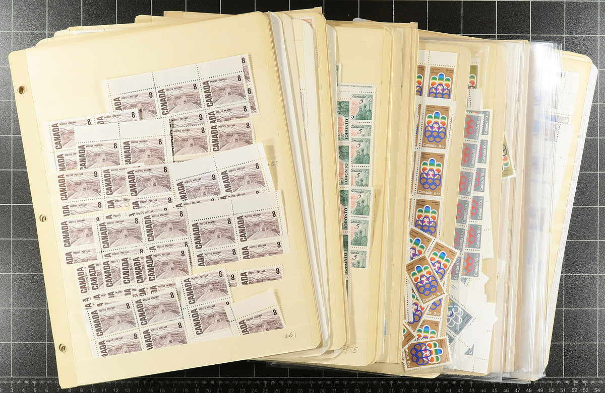 Volume 5 Mint Canada wholesale stock (#461/486, #B1-B12). This volume includes the Centennial mid-values to 25c up to the 15c Vimy memorial. Generally, one issue per stockpage (or page holder). Anywhere from 20 to a couple hundred stamps per item. Lots of multiples with relatively few plate blocks. A quick check indicates that most, if not all, are never hinged. The Centennials have no indication about paper type. Much of the face value is in the Montreal Olympic semi-postals (values to 20c, and we have not counted the surcharge in the total postage. Enormous catalogue value here. Conservative face value =