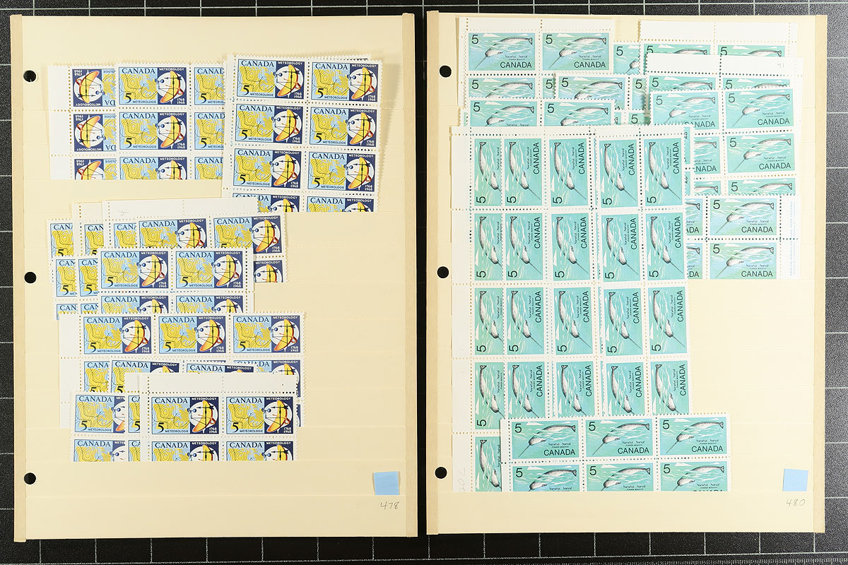 Volume 5 Mint Canada wholesale stock (#461/486, #B1-B12). This volume includes the Centennial mid-values to 25c up to the 15c Vimy memorial. Generally, one issue per stockpage (or page holder). Anywhere from 20 to a couple hundred stamps per item. Lots of multiples with relatively few plate blocks. A quick check indicates that most, if not all, are never hinged. The Centennials have no indication about paper type. Much of the face value is in the Montreal Olympic semi-postals (values to 20c, and we have not counted the surcharge in the total postage. Enormous catalogue value here. Conservative face value =