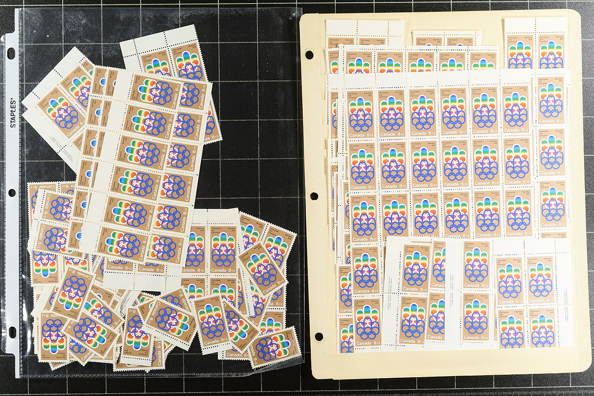 Volume 5 Mint Canada wholesale stock (#461/486, #B1-B12). This volume includes the Centennial mid-values to 25c up to the 15c Vimy memorial. Generally, one issue per stockpage (or page holder). Anywhere from 20 to a couple hundred stamps per item. Lots of multiples with relatively few plate blocks. A quick check indicates that most, if not all, are never hinged. The Centennials have no indication about paper type. Much of the face value is in the Montreal Olympic semi-postals (values to 20c, and we have not counted the surcharge in the total postage. Enormous catalogue value here. Conservative face value =