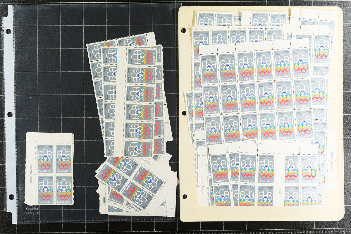 Volume 5 Mint Canada wholesale stock (#461/486, #B1-B12). This volume includes the Centennial mid-values to 25c up to the 15c Vimy memorial. Generally, one issue per stockpage (or page holder). Anywhere from 20 to a couple hundred stamps per item. Lots of multiples with relatively few plate blocks. A quick check indicates that most, if not all, are never hinged. The Centennials have no indication about paper type. Much of the face value is in the Montreal Olympic semi-postals (values to 20c, and we have not counted the surcharge in the total postage. Enormous catalogue value here. Conservative face value =
