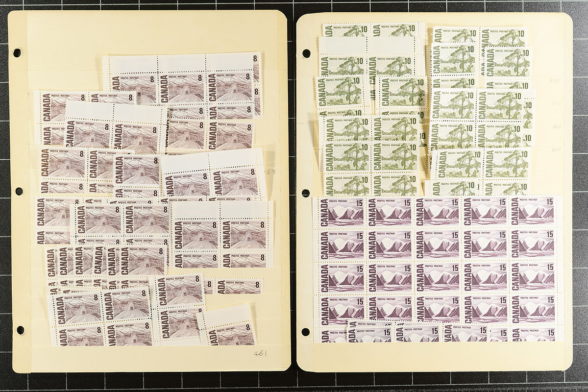 Volume 5 Mint Canada wholesale stock (#461/486, #B1-B12). This volume includes the Centennial mid-values to 25c up to the 15c Vimy memorial. Generally, one issue per stockpage (or page holder). Anywhere from 20 to a couple hundred stamps per item. Lots of multiples with relatively few plate blocks. A quick check indicates that most, if not all, are never hinged. The Centennials have no indication about paper type. Much of the face value is in the Montreal Olympic semi-postals (values to 20c, and we have not counted the surcharge in the total postage. Enormous catalogue value here. Conservative face value =