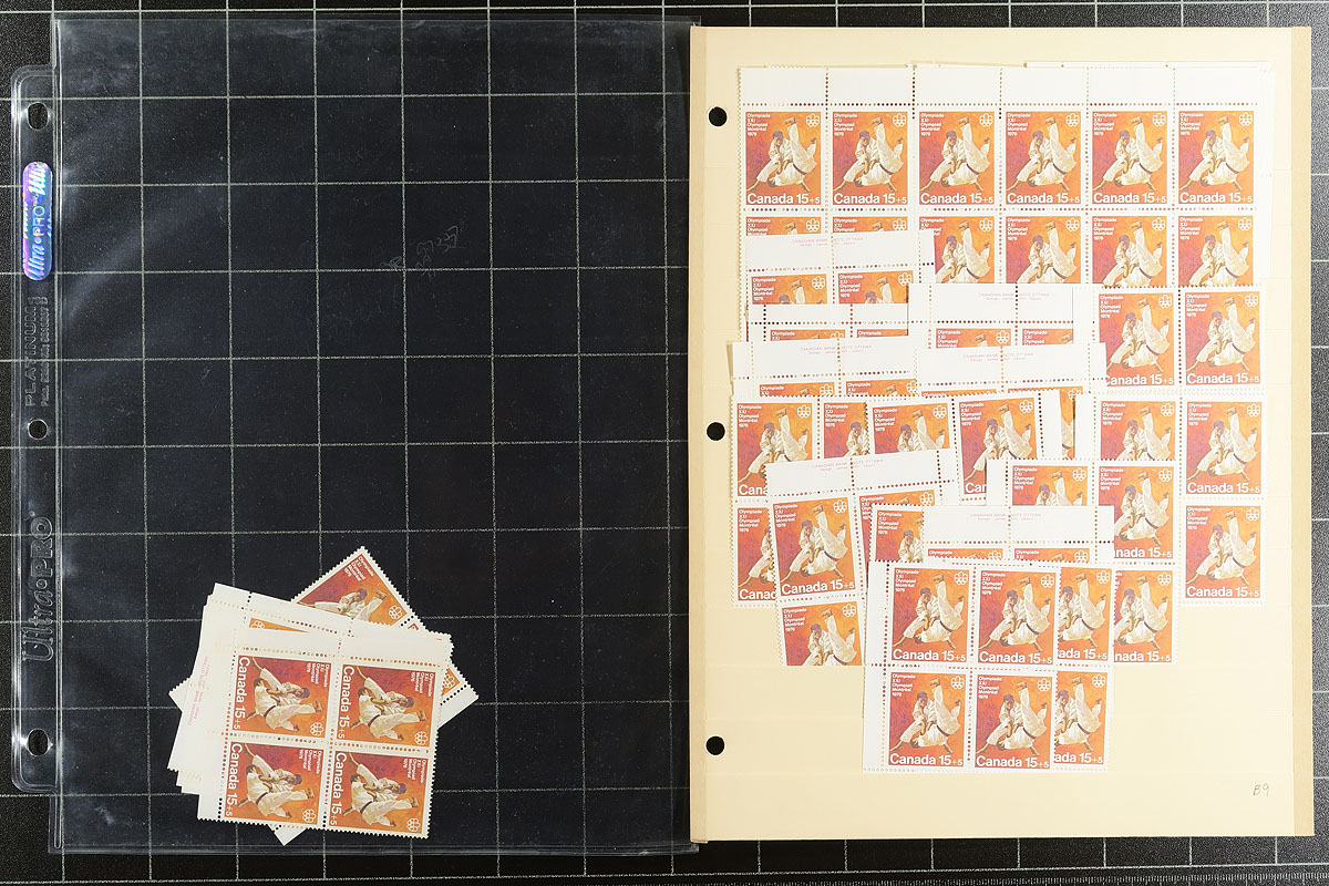 Volume 5 Mint Canada wholesale stock (#461/486, #B1-B12). This volume includes the Centennial mid-values to 25c up to the 15c Vimy memorial. Generally, one issue per stockpage (or page holder). Anywhere from 20 to a couple hundred stamps per item. Lots of multiples with relatively few plate blocks. A quick check indicates that most, if not all, are never hinged. The Centennials have no indication about paper type. Much of the face value is in the Montreal Olympic semi-postals (values to 20c, and we have not counted the surcharge in the total postage. Enormous catalogue value here. Conservative face value =