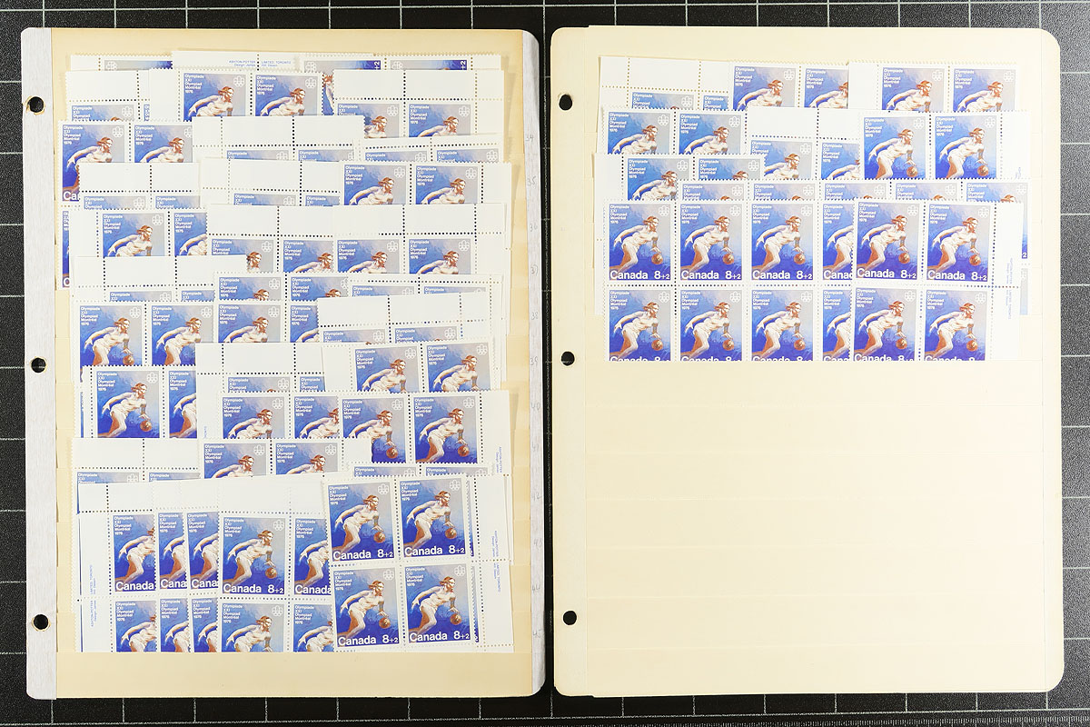 Volume 5 Mint Canada wholesale stock (#461/486, #B1-B12). This volume includes the Centennial mid-values to 25c up to the 15c Vimy memorial. Generally, one issue per stockpage (or page holder). Anywhere from 20 to a couple hundred stamps per item. Lots of multiples with relatively few plate blocks. A quick check indicates that most, if not all, are never hinged. The Centennials have no indication about paper type. Much of the face value is in the Montreal Olympic semi-postals (values to 20c, and we have not counted the surcharge in the total postage. Enormous catalogue value here. Conservative face value =