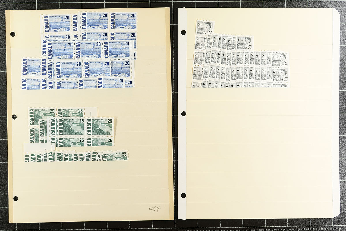 Volume 5 Mint Canada wholesale stock (#461/486, #B1-B12). This volume includes the Centennial mid-values to 25c up to the 15c Vimy memorial. Generally, one issue per stockpage (or page holder). Anywhere from 20 to a couple hundred stamps per item. Lots of multiples with relatively few plate blocks. A quick check indicates that most, if not all, are never hinged. The Centennials have no indication about paper type. Much of the face value is in the Montreal Olympic semi-postals (values to 20c, and we have not counted the surcharge in the total postage. Enormous catalogue value here. Conservative face value =