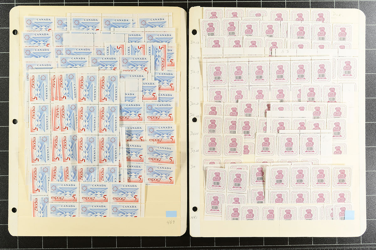 Volume 5 Mint Canada wholesale stock (#461/486, #B1-B12). This volume includes the Centennial mid-values to 25c up to the 15c Vimy memorial. Generally, one issue per stockpage (or page holder). Anywhere from 20 to a couple hundred stamps per item. Lots of multiples with relatively few plate blocks. A quick check indicates that most, if not all, are never hinged. The Centennials have no indication about paper type. Much of the face value is in the Montreal Olympic semi-postals (values to 20c, and we have not counted the surcharge in the total postage. Enormous catalogue value here. Conservative face value =