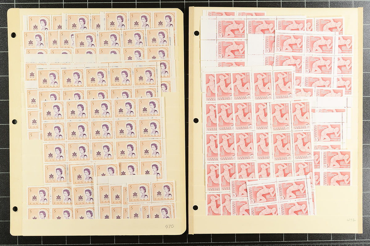 Volume 5 Mint Canada wholesale stock (#461/486, #B1-B12). This volume includes the Centennial mid-values to 25c up to the 15c Vimy memorial. Generally, one issue per stockpage (or page holder). Anywhere from 20 to a couple hundred stamps per item. Lots of multiples with relatively few plate blocks. A quick check indicates that most, if not all, are never hinged. The Centennials have no indication about paper type. Much of the face value is in the Montreal Olympic semi-postals (values to 20c, and we have not counted the surcharge in the total postage. Enormous catalogue value here. Conservative face value =