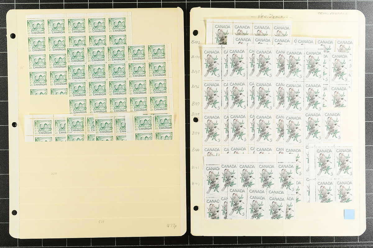 Volume 5 Mint Canada wholesale stock (#461/486, #B1-B12). This volume includes the Centennial mid-values to 25c up to the 15c Vimy memorial. Generally, one issue per stockpage (or page holder). Anywhere from 20 to a couple hundred stamps per item. Lots of multiples with relatively few plate blocks. A quick check indicates that most, if not all, are never hinged. The Centennials have no indication about paper type. Much of the face value is in the Montreal Olympic semi-postals (values to 20c, and we have not counted the surcharge in the total postage. Enormous catalogue value here. Conservative face value =