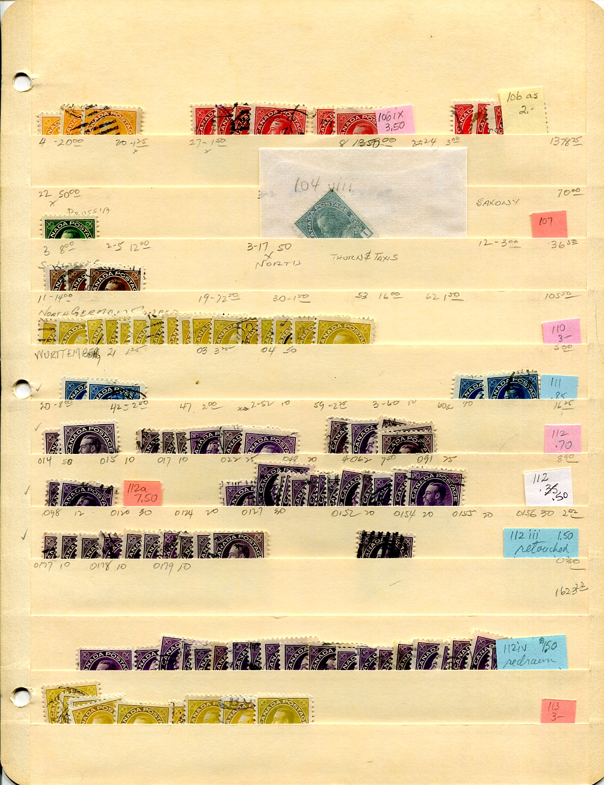 Used extravaganza part 3: Admirals to both 1927 commemorative sets on four manila stockpages. There are some identified as Unitrade sub-numbers (retouches, papers, shades, etc.). There is a nice group of coils, including a couple of pairs of #123 and another of #133. The imperforates are mostly singles and not considered for the value (but there is a nice pair of the 3c). There is a single "one-line" revalue and five copies of the "2-line" (#140). Nine complete Confederation anniversary sets and 4 "McGee" sets can be made with many leftovers. Quantities up to about a dozen of a type. Condition is pretty good, centring is mixed, as is normal. Items individually identified and catalogued about a decade ago. Estimate =