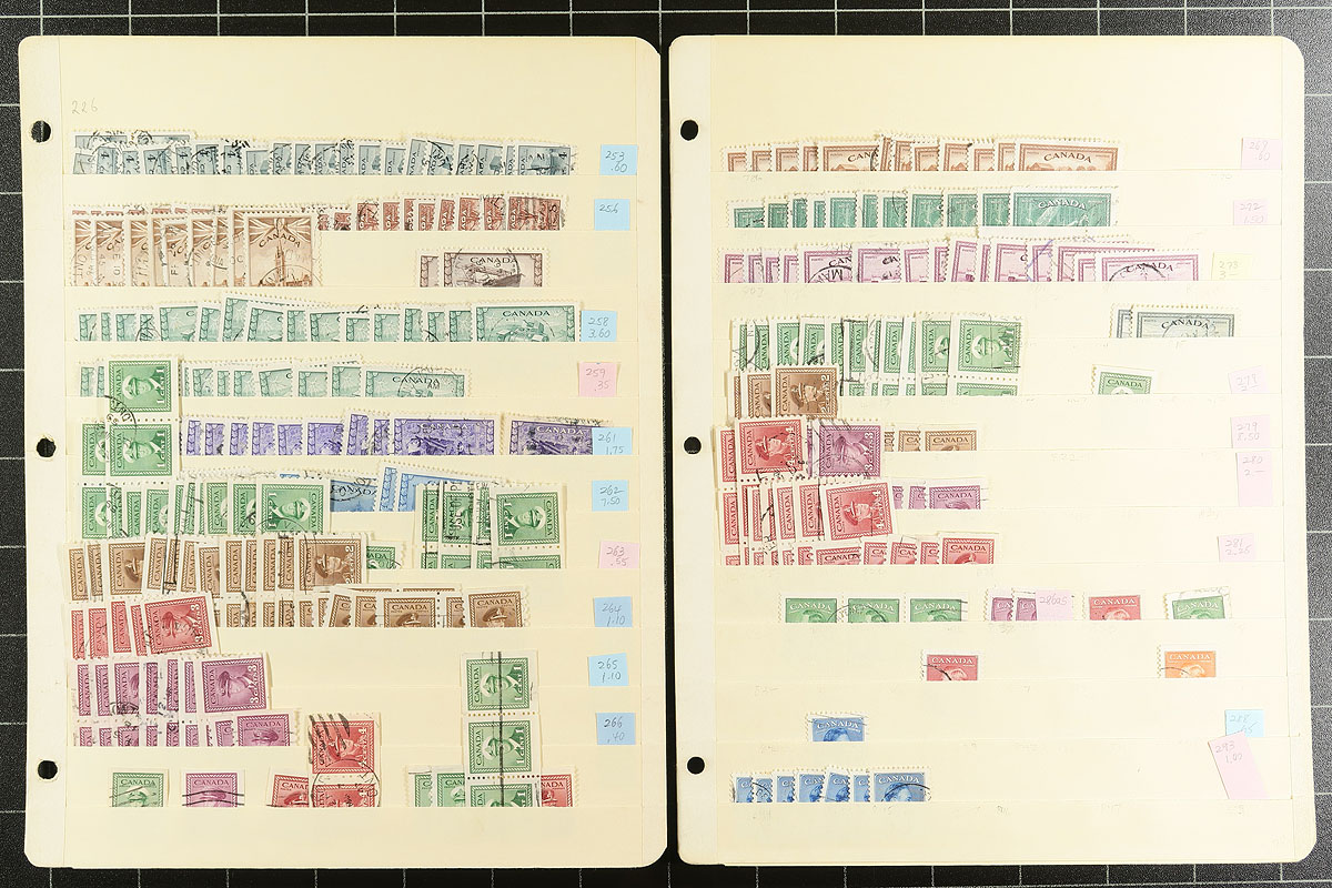 Used extravaganza part 6: Late King George V up to the Totem dollar. Only the higher denomination "Medallion", 18x Grain Exhibition, a number of Silver Jubilee sets (and extras), Champlain, Chateau, Destroyer, Peace and Fisheries dollar stamps in good quantities. The sleeper here may be all the coils, including a number of pairs. The catalogue value on these adds up quickly. Quantities up to a couple of dozen of a type. Condition is pretty good, and a number have socked-on-the-nose cancels. On eight manila stockpages. Estimate =