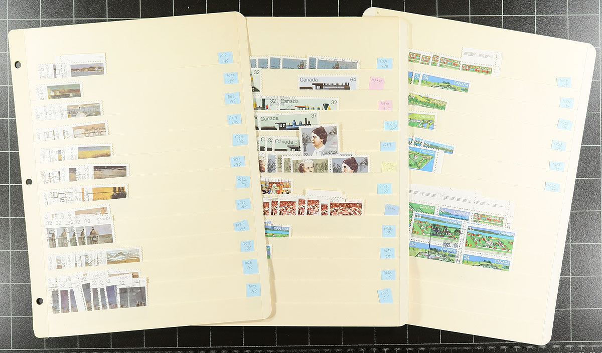Used extravaganza part 7: Early Queen Elizabeth era up to 1997. A bit thin until the late 1960s, and we noted Expo ’70 (a number of positional pairs and blocks), 6c Xmas ’70 centre block (late usage), Geological, Olympics, $2 Commonwealth Day, Mammals (#1178c x3), Art, etc. Includes about a dozen pages that are just "tagged" stamps, where there were also "untagged" stamps issued, plus some coils (including pairs) and a number of partial to complete booklet panes. 74 manila stockpages in two binders, with at least 4,000 well organized stamps here. Quantities up to a couple of dozen of a type. Condition is pretty good and there should be some nice modern cancels here. Estimate=