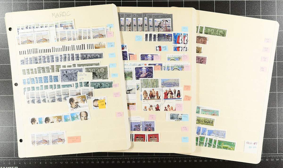 Used extravaganza part 7: Early Queen Elizabeth era up to 1997. A bit thin until the late 1960s, and we noted Expo ’70 (a number of positional pairs and blocks), 6c Xmas ’70 centre block (late usage), Geological, Olympics, $2 Commonwealth Day, Mammals (#1178c x3), Art, etc. Includes about a dozen pages that are just "tagged" stamps, where there were also "untagged" stamps issued, plus some coils (including pairs) and a number of partial to complete booklet panes. 74 manila stockpages in two binders, with at least 4,000 well organized stamps here. Quantities up to a couple of dozen of a type. Condition is pretty good and there should be some nice modern cancels here. Estimate=