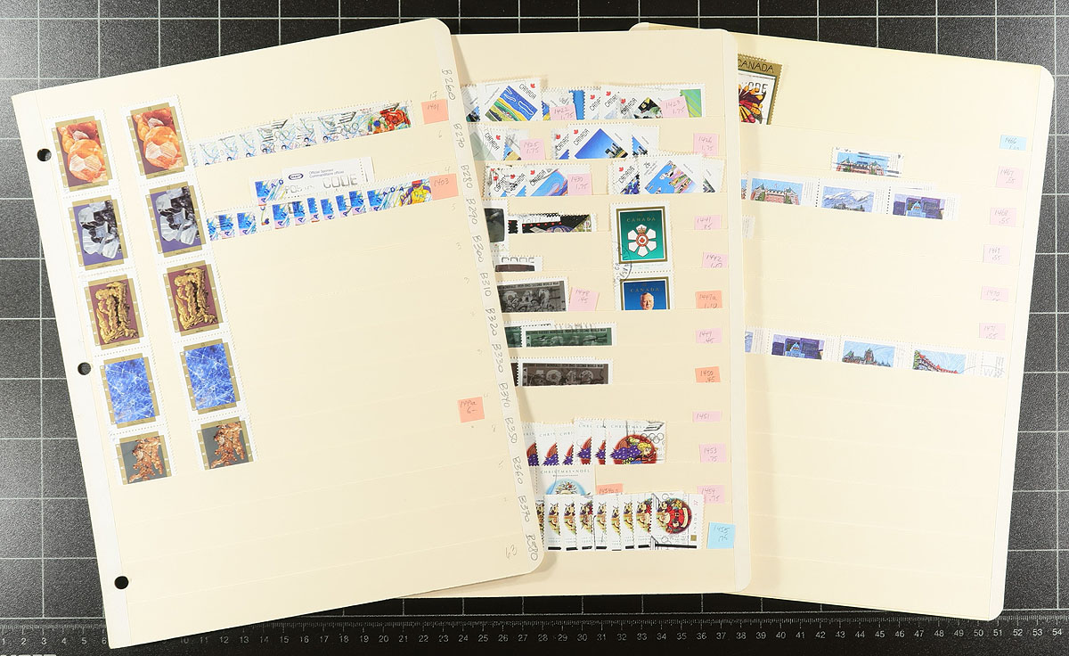 Used extravaganza part 7: Early Queen Elizabeth era up to 1997. A bit thin until the late 1960s, and we noted Expo ’70 (a number of positional pairs and blocks), 6c Xmas ’70 centre block (late usage), Geological, Olympics, $2 Commonwealth Day, Mammals (#1178c x3), Art, etc. Includes about a dozen pages that are just "tagged" stamps, where there were also "untagged" stamps issued, plus some coils (including pairs) and a number of partial to complete booklet panes. 74 manila stockpages in two binders, with at least 4,000 well organized stamps here. Quantities up to a couple of dozen of a type. Condition is pretty good and there should be some nice modern cancels here. Estimate=