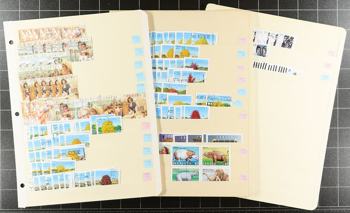 Used extravaganza part 7: Early Queen Elizabeth era up to 1997. A bit thin until the late 1960s, and we noted Expo ’70 (a number of positional pairs and blocks), 6c Xmas ’70 centre block (late usage), Geological, Olympics, $2 Commonwealth Day, Mammals (#1178c x3), Art, etc. Includes about a dozen pages that are just "tagged" stamps, where there were also "untagged" stamps issued, plus some coils (including pairs) and a number of partial to complete booklet panes. 74 manila stockpages in two binders, with at least 4,000 well organized stamps here. Quantities up to a couple of dozen of a type. Condition is pretty good and there should be some nice modern cancels here. Estimate=