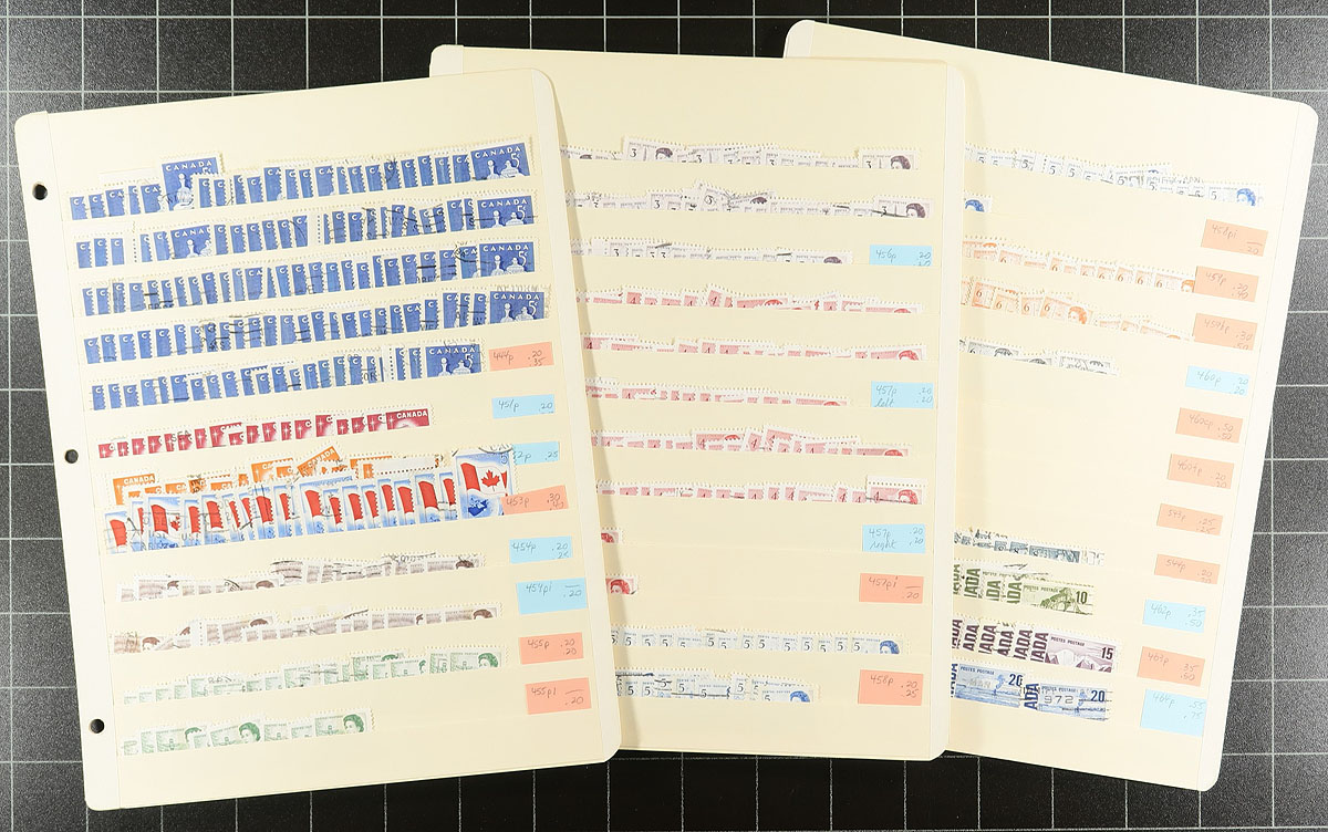 Used extravaganza part 7: Early Queen Elizabeth era up to 1997. A bit thin until the late 1960s, and we noted Expo ’70 (a number of positional pairs and blocks), 6c Xmas ’70 centre block (late usage), Geological, Olympics, $2 Commonwealth Day, Mammals (#1178c x3), Art, etc. Includes about a dozen pages that are just "tagged" stamps, where there were also "untagged" stamps issued, plus some coils (including pairs) and a number of partial to complete booklet panes. 74 manila stockpages in two binders, with at least 4,000 well organized stamps here. Quantities up to a couple of dozen of a type. Condition is pretty good and there should be some nice modern cancels here. Estimate=