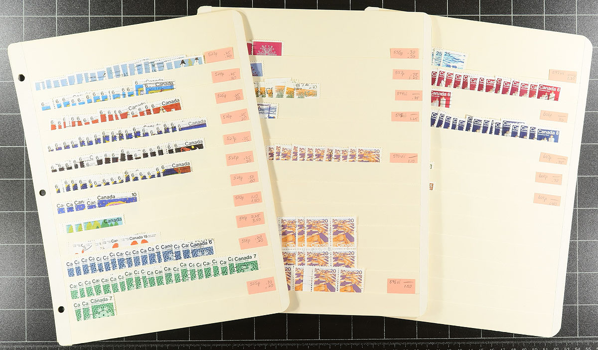 Used extravaganza part 7: Early Queen Elizabeth era up to 1997. A bit thin until the late 1960s, and we noted Expo ’70 (a number of positional pairs and blocks), 6c Xmas ’70 centre block (late usage), Geological, Olympics, $2 Commonwealth Day, Mammals (#1178c x3), Art, etc. Includes about a dozen pages that are just "tagged" stamps, where there were also "untagged" stamps issued, plus some coils (including pairs) and a number of partial to complete booklet panes. 74 manila stockpages in two binders, with at least 4,000 well organized stamps here. Quantities up to a couple of dozen of a type. Condition is pretty good and there should be some nice modern cancels here. Estimate=