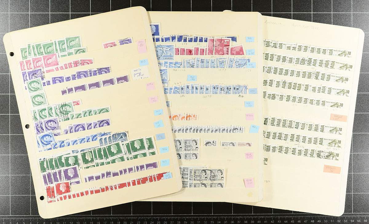 Used extravaganza part 7: Early Queen Elizabeth era up to 1997. A bit thin until the late 1960s, and we noted Expo ’70 (a number of positional pairs and blocks), 6c Xmas ’70 centre block (late usage), Geological, Olympics, $2 Commonwealth Day, Mammals (#1178c x3), Art, etc. Includes about a dozen pages that are just "tagged" stamps, where there were also "untagged" stamps issued, plus some coils (including pairs) and a number of partial to complete booklet panes. 74 manila stockpages in two binders, with at least 4,000 well organized stamps here. Quantities up to a couple of dozen of a type. Condition is pretty good and there should be some nice modern cancels here. Estimate=