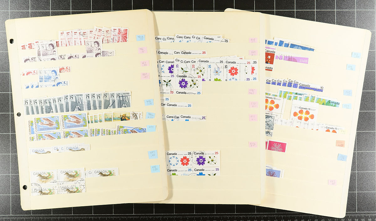 Used extravaganza part 7: Early Queen Elizabeth era up to 1997. A bit thin until the late 1960s, and we noted Expo ’70 (a number of positional pairs and blocks), 6c Xmas ’70 centre block (late usage), Geological, Olympics, $2 Commonwealth Day, Mammals (#1178c x3), Art, etc. Includes about a dozen pages that are just "tagged" stamps, where there were also "untagged" stamps issued, plus some coils (including pairs) and a number of partial to complete booklet panes. 74 manila stockpages in two binders, with at least 4,000 well organized stamps here. Quantities up to a couple of dozen of a type. Condition is pretty good and there should be some nice modern cancels here. Estimate=