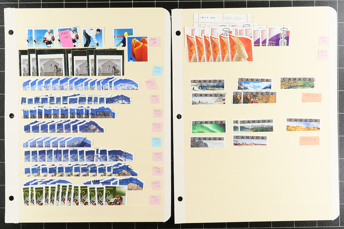 Used extravaganza part 8: Mid to late Queen Elizabeth from late 1998 to 2012. Lots of better items throughout, saw $8 Grizzly blocks of four, Art stamps, $10 Blue Whale, se-tenant, lots of US and International rate stamps, even all four of the "Write Me, Ring Me" stamps used in period. Consistent with the time period, the popular hockey-themed stamps are everywhere. 52 manila stockpages in a large binder, with at least 4,000 well organized stamps here. Quantities up to a couple of dozen of a type. Condition is pretty good and there should be some nice modern cancels here. Estimate =