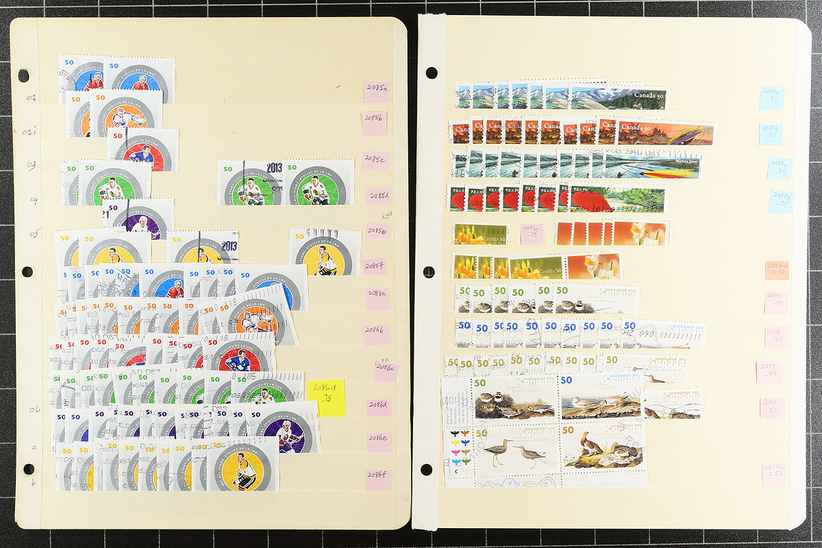 Used extravaganza part 8: Mid to late Queen Elizabeth from late 1998 to 2012. Lots of better items throughout, saw $8 Grizzly blocks of four, Art stamps, $10 Blue Whale, se-tenant, lots of US and International rate stamps, even all four of the "Write Me, Ring Me" stamps used in period. Consistent with the time period, the popular hockey-themed stamps are everywhere. 52 manila stockpages in a large binder, with at least 4,000 well organized stamps here. Quantities up to a couple of dozen of a type. Condition is pretty good and there should be some nice modern cancels here. Estimate =