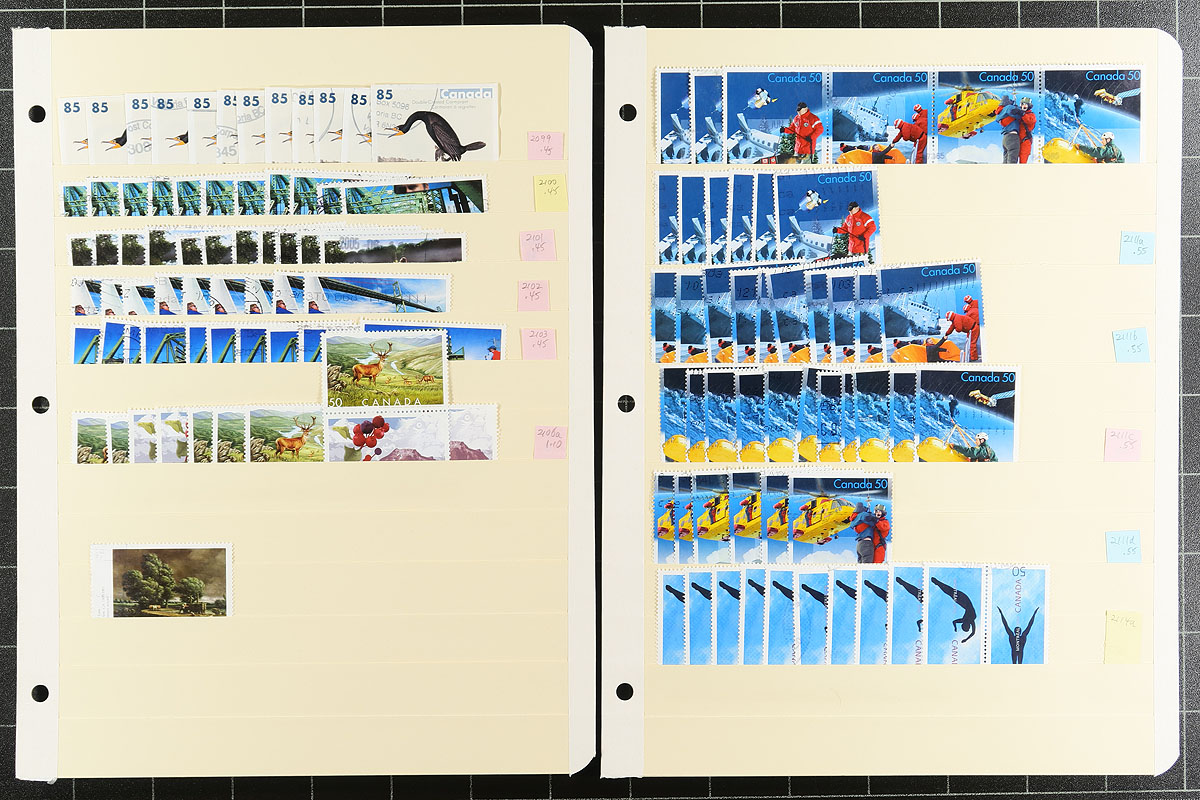 Used extravaganza part 8: Mid to late Queen Elizabeth from late 1998 to 2012. Lots of better items throughout, saw $8 Grizzly blocks of four, Art stamps, $10 Blue Whale, se-tenant, lots of US and International rate stamps, even all four of the "Write Me, Ring Me" stamps used in period. Consistent with the time period, the popular hockey-themed stamps are everywhere. 52 manila stockpages in a large binder, with at least 4,000 well organized stamps here. Quantities up to a couple of dozen of a type. Condition is pretty good and there should be some nice modern cancels here. Estimate =