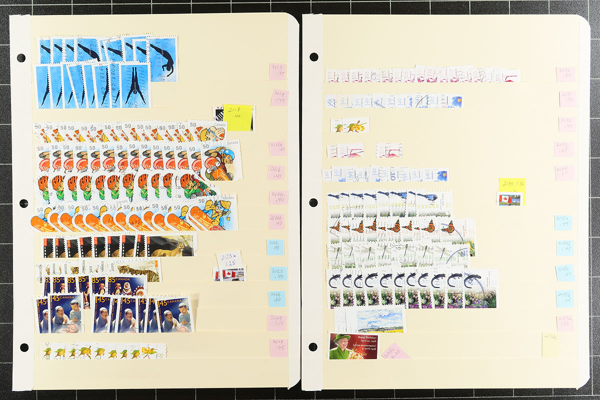 Used extravaganza part 8: Mid to late Queen Elizabeth from late 1998 to 2012. Lots of better items throughout, saw $8 Grizzly blocks of four, Art stamps, $10 Blue Whale, se-tenant, lots of US and International rate stamps, even all four of the "Write Me, Ring Me" stamps used in period. Consistent with the time period, the popular hockey-themed stamps are everywhere. 52 manila stockpages in a large binder, with at least 4,000 well organized stamps here. Quantities up to a couple of dozen of a type. Condition is pretty good and there should be some nice modern cancels here. Estimate =
