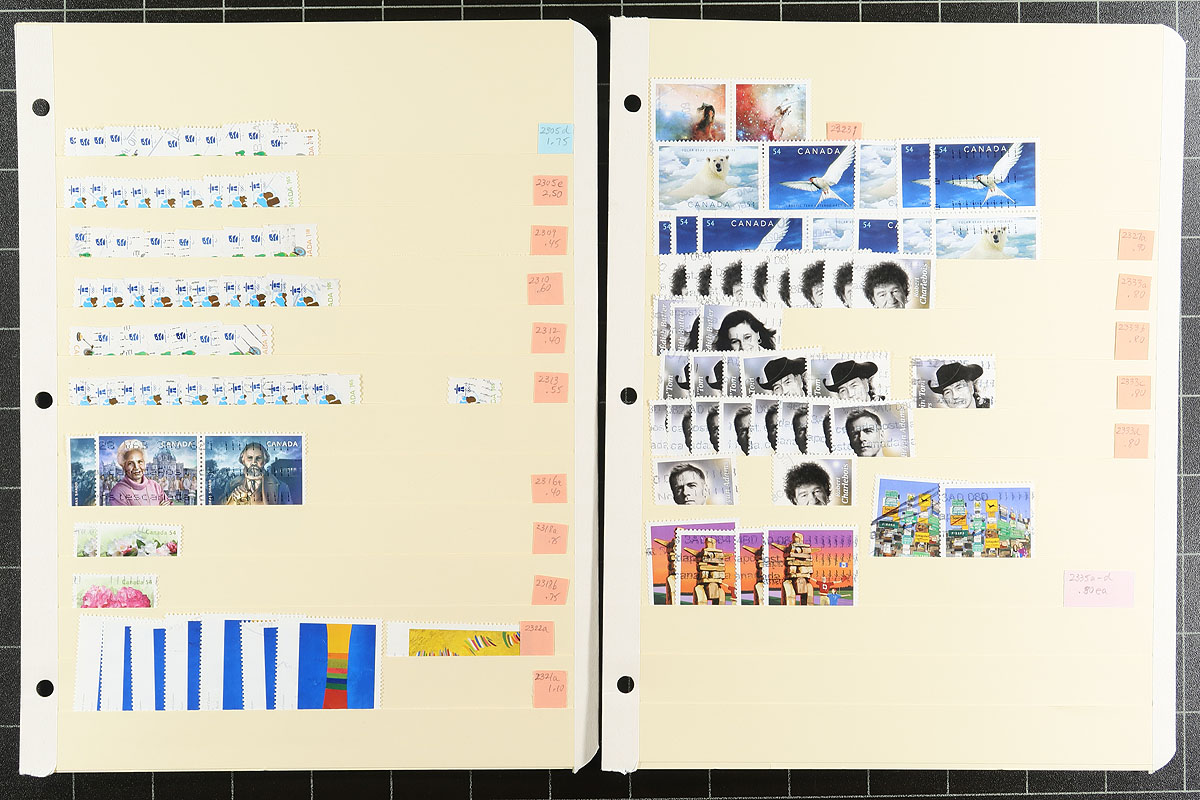 Used extravaganza part 8: Mid to late Queen Elizabeth from late 1998 to 2012. Lots of better items throughout, saw $8 Grizzly blocks of four, Art stamps, $10 Blue Whale, se-tenant, lots of US and International rate stamps, even all four of the "Write Me, Ring Me" stamps used in period. Consistent with the time period, the popular hockey-themed stamps are everywhere. 52 manila stockpages in a large binder, with at least 4,000 well organized stamps here. Quantities up to a couple of dozen of a type. Condition is pretty good and there should be some nice modern cancels here. Estimate =