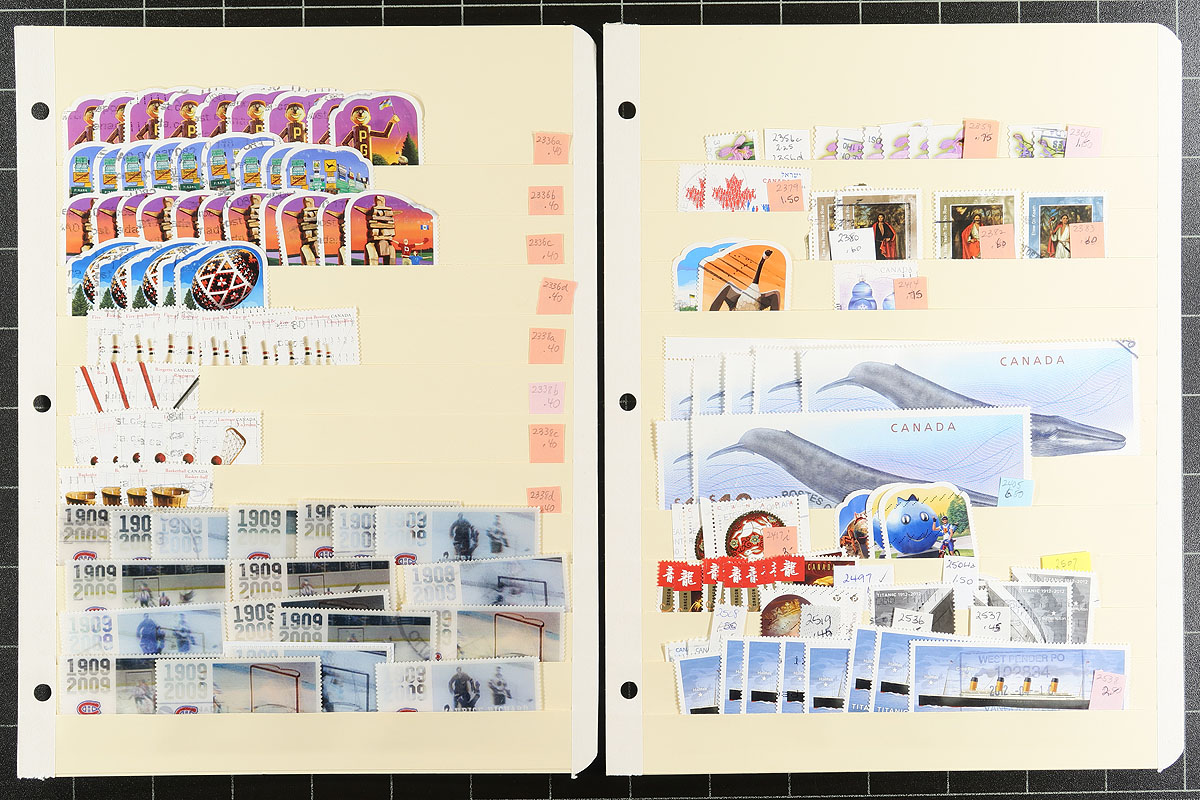 Used extravaganza part 8: Mid to late Queen Elizabeth from late 1998 to 2012. Lots of better items throughout, saw $8 Grizzly blocks of four, Art stamps, $10 Blue Whale, se-tenant, lots of US and International rate stamps, even all four of the "Write Me, Ring Me" stamps used in period. Consistent with the time period, the popular hockey-themed stamps are everywhere. 52 manila stockpages in a large binder, with at least 4,000 well organized stamps here. Quantities up to a couple of dozen of a type. Condition is pretty good and there should be some nice modern cancels here. Estimate =