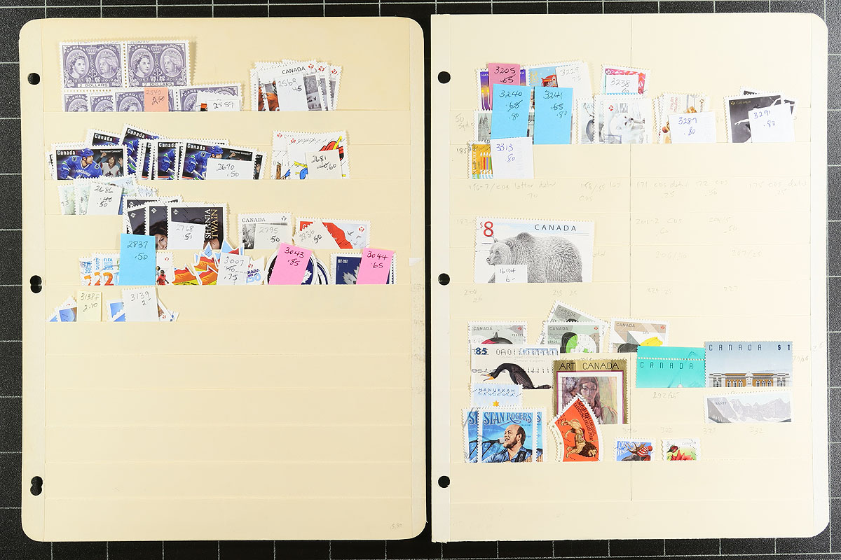 Used extravaganza part 8: Mid to late Queen Elizabeth from late 1998 to 2012. Lots of better items throughout, saw $8 Grizzly blocks of four, Art stamps, $10 Blue Whale, se-tenant, lots of US and International rate stamps, even all four of the "Write Me, Ring Me" stamps used in period. Consistent with the time period, the popular hockey-themed stamps are everywhere. 52 manila stockpages in a large binder, with at least 4,000 well organized stamps here. Quantities up to a couple of dozen of a type. Condition is pretty good and there should be some nice modern cancels here. Estimate =