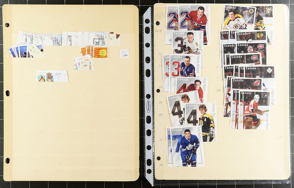 Used extravaganza part 8: Mid to late Queen Elizabeth from late 1998 to 2012. Lots of better items throughout, saw $8 Grizzly blocks of four, Art stamps, $10 Blue Whale, se-tenant, lots of US and International rate stamps, even all four of the "Write Me, Ring Me" stamps used in period. Consistent with the time period, the popular hockey-themed stamps are everywhere. 52 manila stockpages in a large binder, with at least 4,000 well organized stamps here. Quantities up to a couple of dozen of a type. Condition is pretty good and there should be some nice modern cancels here. Estimate =
