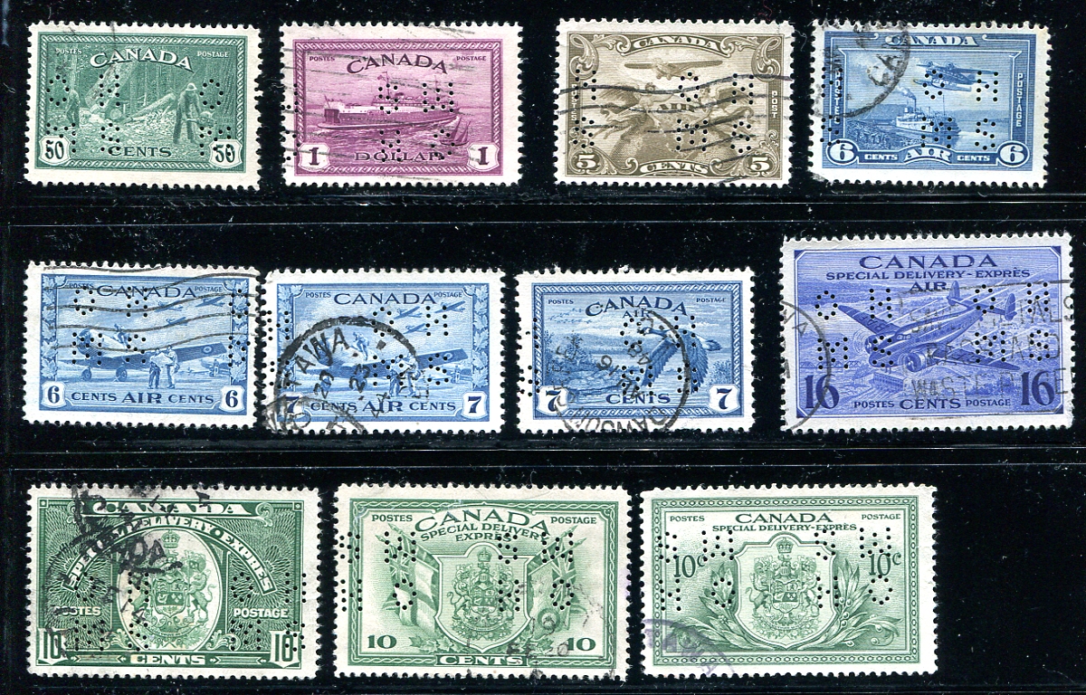 A nice selection of used War Tax and 5-hole and 4-hole OHMS perfin group of King George V and King George VI issues. The War Tax includes dies, shades and coils. The 5-hole OHMS perfins include the 3c and 50c Admiral, and the 10c Cartier. There is a good run of 4-hole perfins of the regular issues, including the Chateau, Destroyer and Ferry dollars, plus some air mail and special delivery stamps. Nicely cancels and most perfins are clear of the regular perforations! Owner's 2021 Scott Specialized US$600.85 =