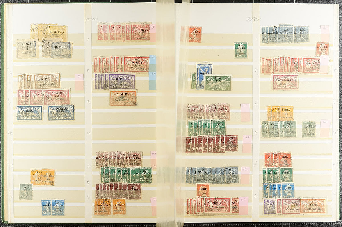 Used accumulation part 1: The period from 1919 to 1980 in an older 32-page Lighthouse stockbook. Lots of early overprints on French stamps, with individual items cataloguing up to $20.00 each. Good coverage, with up to 10 of a type, few faults and some cancel potential. One collector’s material which has never been on the market before. Estimate =