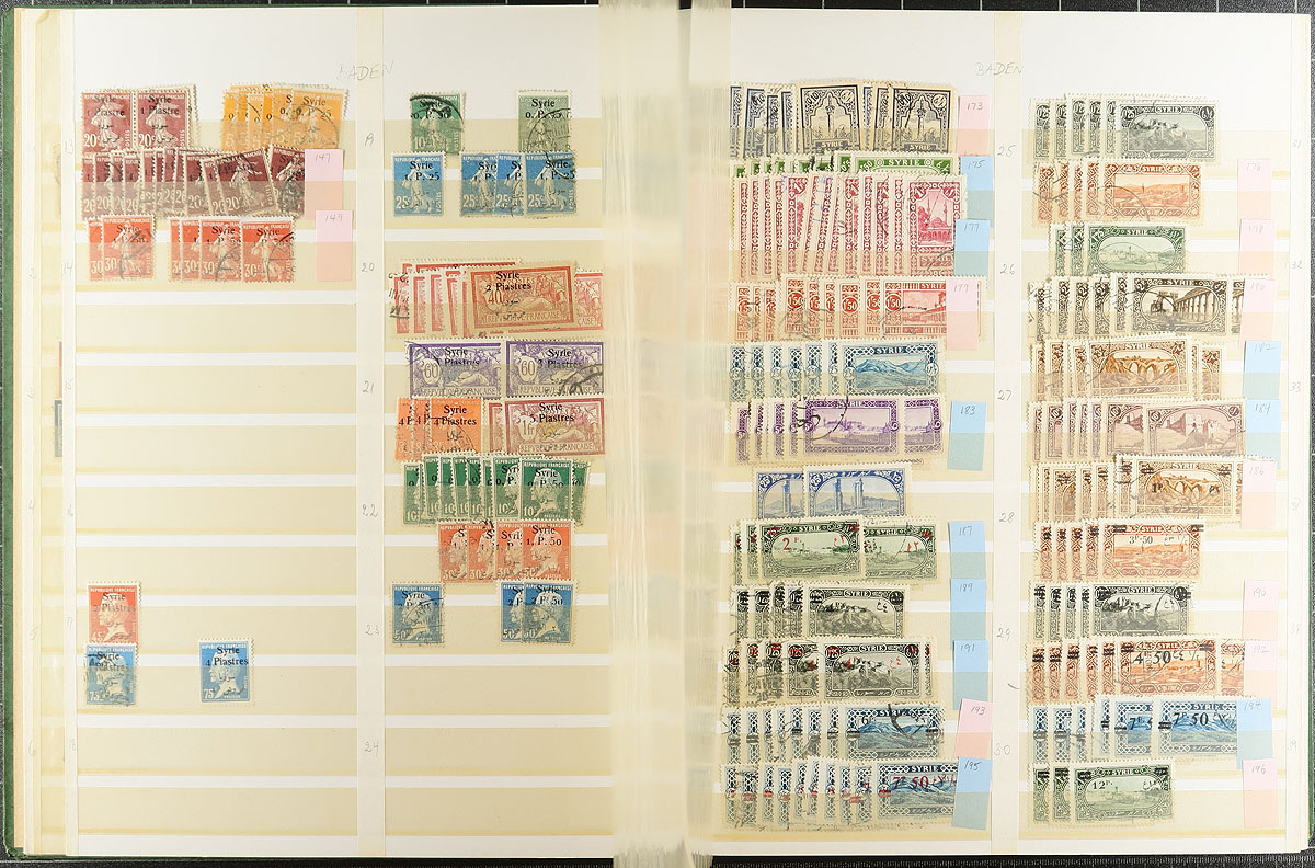 Used accumulation part 1: The period from 1919 to 1980 in an older 32-page Lighthouse stockbook. Lots of early overprints on French stamps, with individual items cataloguing up to $20.00 each. Good coverage, with up to 10 of a type, few faults and some cancel potential. One collector’s material which has never been on the market before. Estimate =