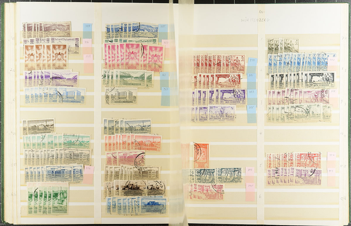 Used accumulation part 1: The period from 1919 to 1980 in an older 32-page Lighthouse stockbook. Lots of early overprints on French stamps, with individual items cataloguing up to $20.00 each. Good coverage, with up to 10 of a type, few faults and some cancel potential. One collector’s material which has never been on the market before. Estimate =