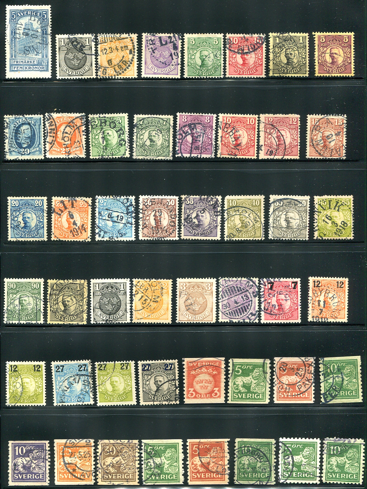 Two pages of nice used early, and all different, 20th century Sweden, with some better early "Heraldic Lion" and "Vasa" coils, plus 8 assorted stamps from the two 1924 UPU issues. A mix of common and better singles (#131, #206, #218), with a number of striking postmarks. 2024 Scott US$498.20 =