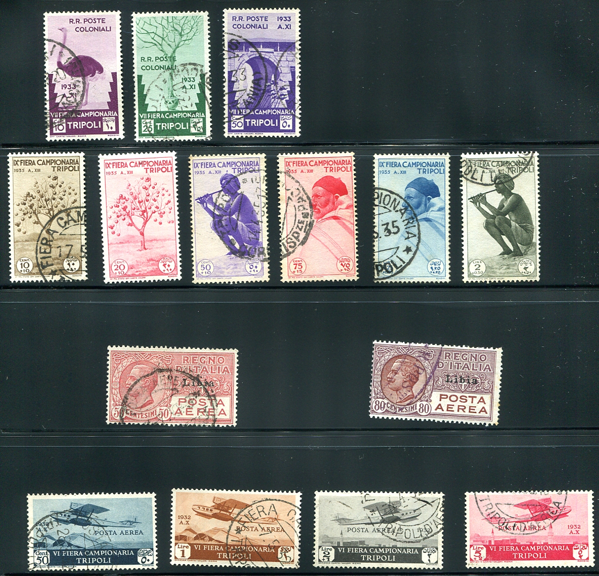Used examples from the 1933 Seventh Sample Fair and a complete set of the 1935 Ninth Sample Fair semi-postals, and the 1928-29 "Libia" overprints on Italian airmail issues plus the 1932 air mail set that was issued along with the Sixth Sample Fair semi-postals. Great appearance, cancels look good, but we will let you be the judge. 2024 Scott US$765.00 =