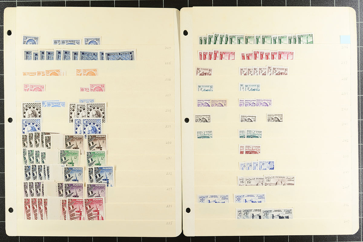 Part 1 of a clean and comprehensive mint accumulation on 24 manila stockpages. Includes many sets, some better singles, overprints, from the French colonial period to 1962. There is a small group of #1/#8, which we are presuming are reprints. Items have catalogue values up to $20.00 (#21, #139, #363A, #363B). Quantities are up to 15 of a type and there is a mix of hinged and never hinged material. A couple of thousand stamps here. You never see collector holdings of this size from this North African country. Estimate =