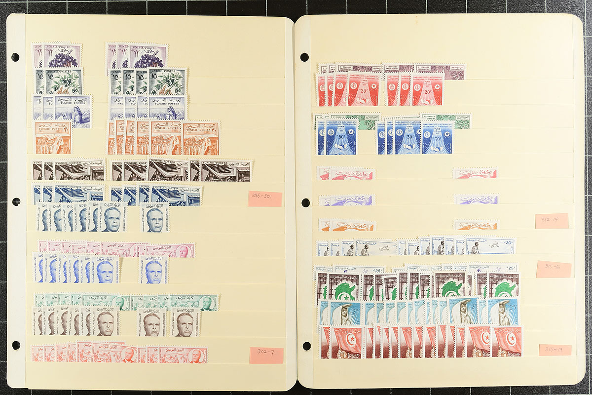 Part 1 of a clean and comprehensive mint accumulation on 24 manila stockpages. Includes many sets, some better singles, overprints, from the French colonial period to 1962. There is a small group of #1/#8, which we are presuming are reprints. Items have catalogue values up to $20.00 (#21, #139, #363A, #363B). Quantities are up to 15 of a type and there is a mix of hinged and never hinged material. A couple of thousand stamps here. You never see collector holdings of this size from this North African country. Estimate =
