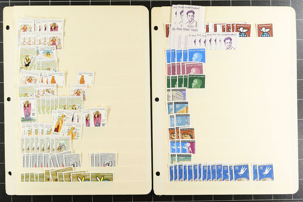 Part 2 of a clean and comprehensive mint accumulation on 27 manila stockpages. Includes many sets from 1962 to 1979. Lots of topical interest, better items here and there (blocks of 4 of #658-663). Quantities are up to 10 of a type and there is a mix of hinged and (mostly) never hinged material. A couple of thousand stamps here. You never see collector holdings of this size from this North African country. Estimate =