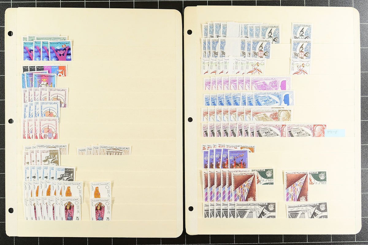 Part 2 of a clean and comprehensive mint accumulation on 27 manila stockpages. Includes many sets from 1962 to 1979. Lots of topical interest, better items here and there (blocks of 4 of #658-663). Quantities are up to 10 of a type and there is a mix of hinged and (mostly) never hinged material. A couple of thousand stamps here. You never see collector holdings of this size from this North African country. Estimate =