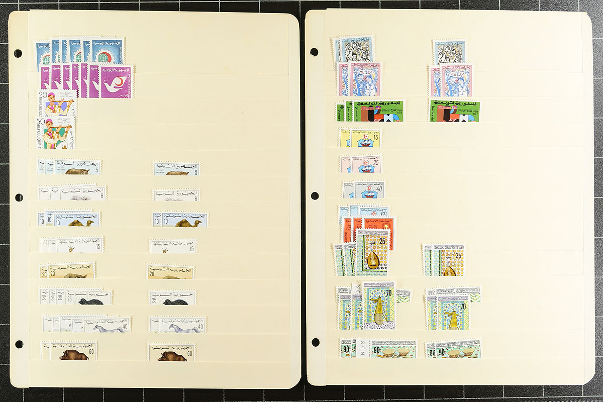 Part 2 of a clean and comprehensive mint accumulation on 27 manila stockpages. Includes many sets from 1962 to 1979. Lots of topical interest, better items here and there (blocks of 4 of #658-663). Quantities are up to 10 of a type and there is a mix of hinged and (mostly) never hinged material. A couple of thousand stamps here. You never see collector holdings of this size from this North African country. Estimate =