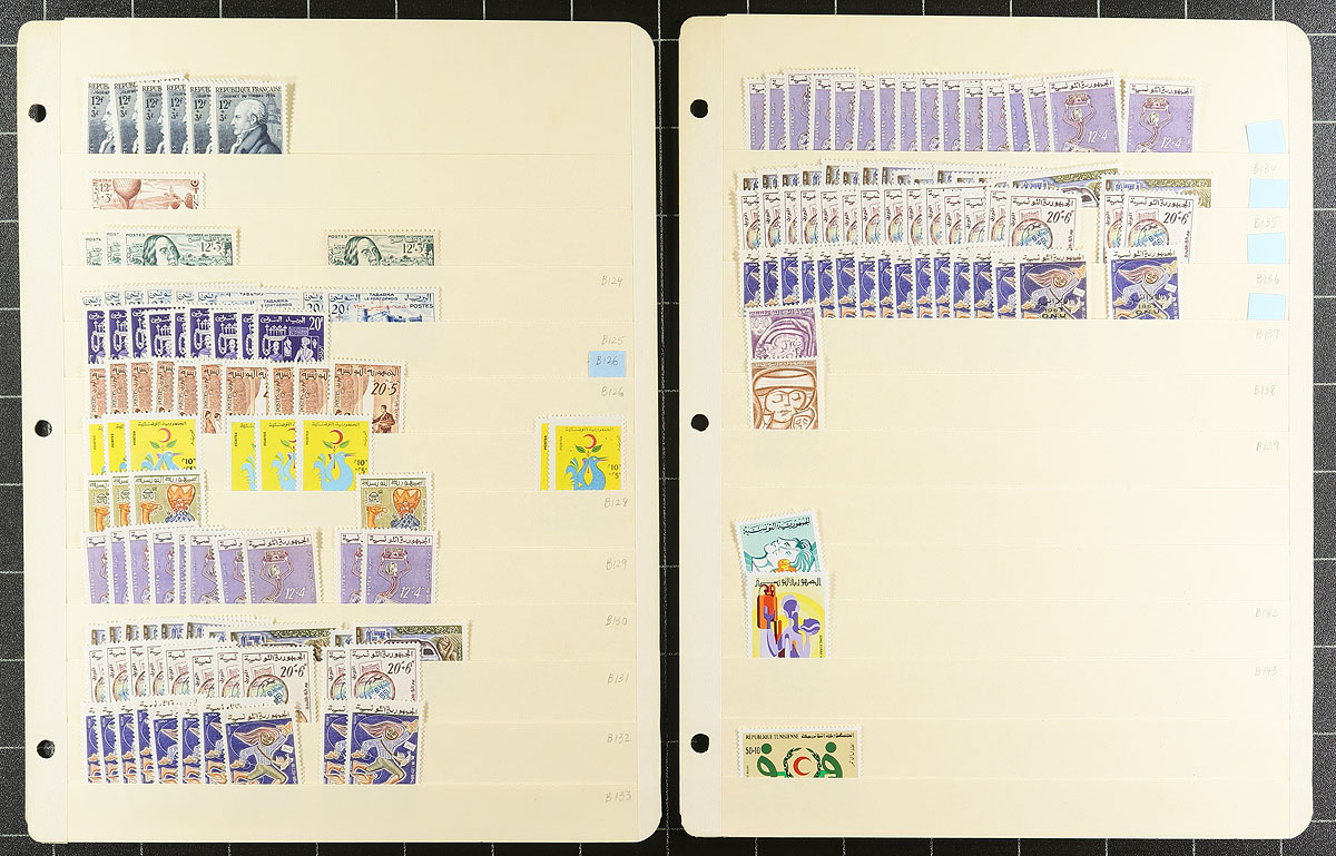 Part 3 of a clean and comprehensive mint accumulation on 16 manila stockpages, this volume is all back of the book. Includes good coverage of the semi-postals into the mid-1970's. There is a nice selection of "T" perfins, which acted as the early postage dues (listed in Scott Specialized, noting #JA7 and #JA22). The conventional postage dues are well represented (noting #J10) as well as a good grouping of parcel post stamps (#Q10, Q25). Quantities are up to 8 of a type and there is a mix of hinged and never hinged material. You never see collector holdings of this size from this North African country. Estimate =