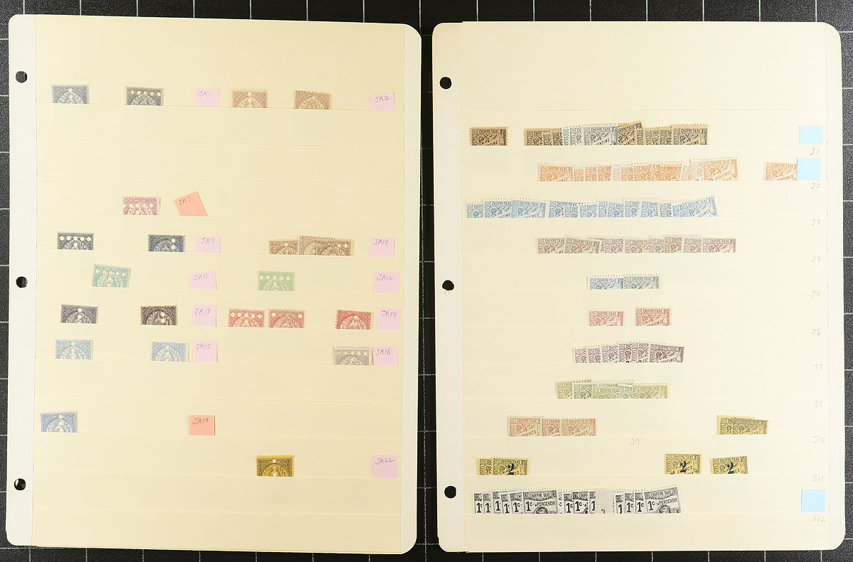 Part 3 of a clean and comprehensive mint accumulation on 16 manila stockpages, this volume is all back of the book. Includes good coverage of the semi-postals into the mid-1970's. There is a nice selection of "T" perfins, which acted as the early postage dues (listed in Scott Specialized, noting #JA7 and #JA22). The conventional postage dues are well represented (noting #J10) as well as a good grouping of parcel post stamps (#Q10, Q25). Quantities are up to 8 of a type and there is a mix of hinged and never hinged material. You never see collector holdings of this size from this North African country. Estimate =