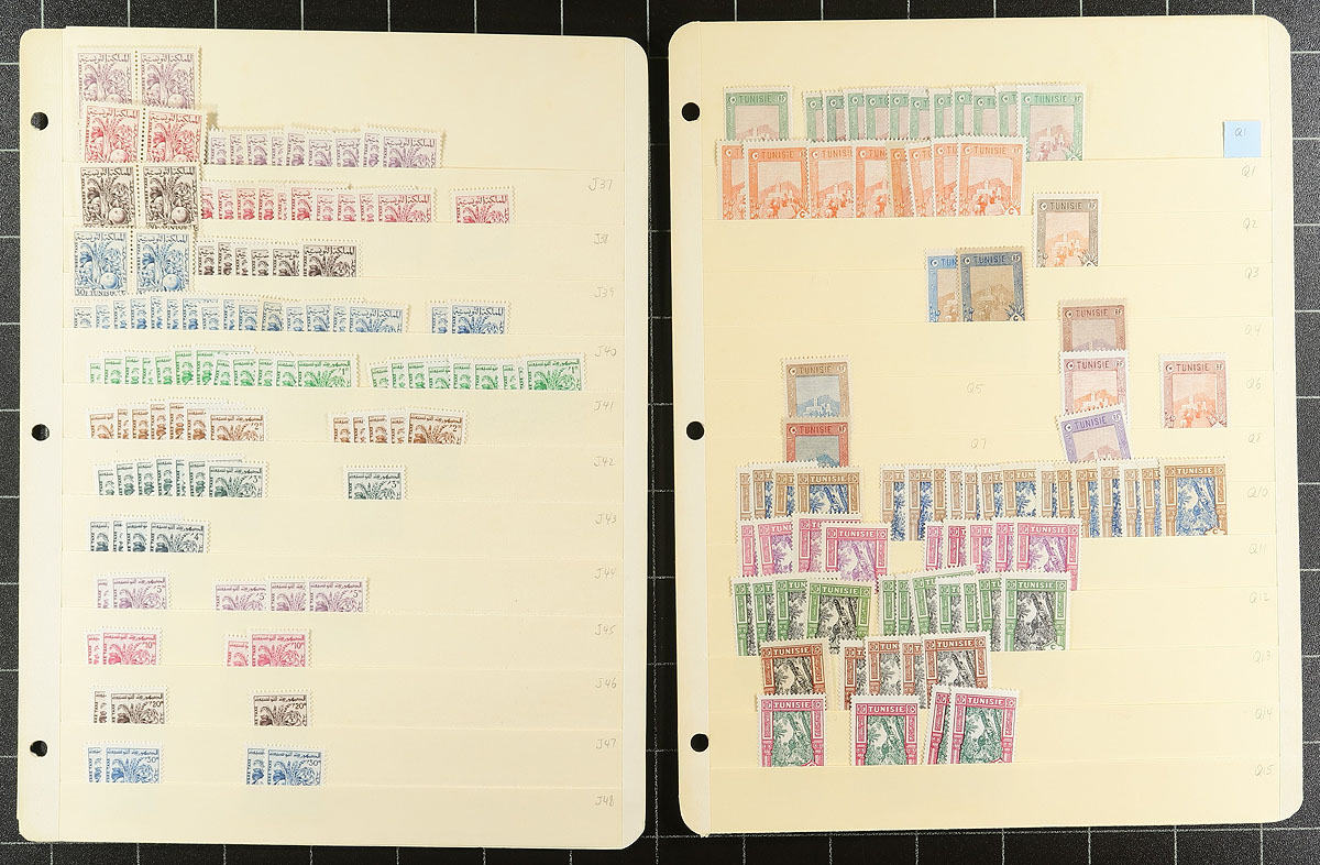 Part 3 of a clean and comprehensive mint accumulation on 16 manila stockpages, this volume is all back of the book. Includes good coverage of the semi-postals into the mid-1970's. There is a nice selection of "T" perfins, which acted as the early postage dues (listed in Scott Specialized, noting #JA7 and #JA22). The conventional postage dues are well represented (noting #J10) as well as a good grouping of parcel post stamps (#Q10, Q25). Quantities are up to 8 of a type and there is a mix of hinged and never hinged material. You never see collector holdings of this size from this North African country. Estimate =