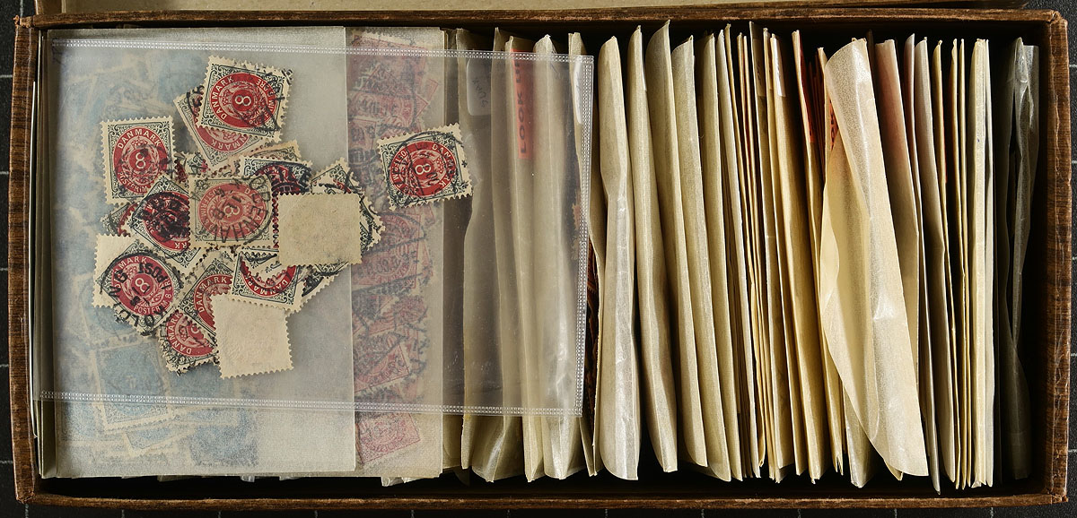 A chaotic holding of used, off paper, from the first half of the 20th century "Ore" issues to about 1950. Sometimes sorted by stamp, sometimes by issue, sometimes not at all, in about 100 old glassine envelopes that give no clues as to their contents. Lots of range, mostly more common material with many "Coat of Arms", wavy-line numerals, and King Christian X issues. Includes some multiples. Substantial duplication. Substantial cancel potential as every envelope seems to have lots of readable cancels. Presumably not checked against Facit for printing variants. Fills a medium sized file-card box. Estimate =